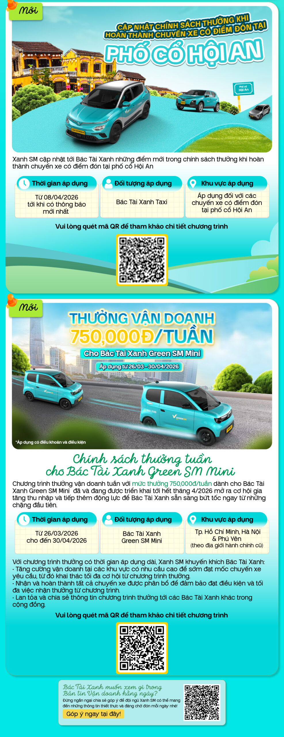 Bác Tài Xanh thân mến, Xanh SM cập nhật tới Bác Tài Xanh những điểm mới trong chính sách thưởng khi hoàn thành chuyến xe có điểm đón tại phố cổHội An, cụ thể như sau: • Thời gian áp dụng: Từ 08/04/2026 tới khi có thông báo mới nhất• Đối tượng áp dụng: Bác […]
