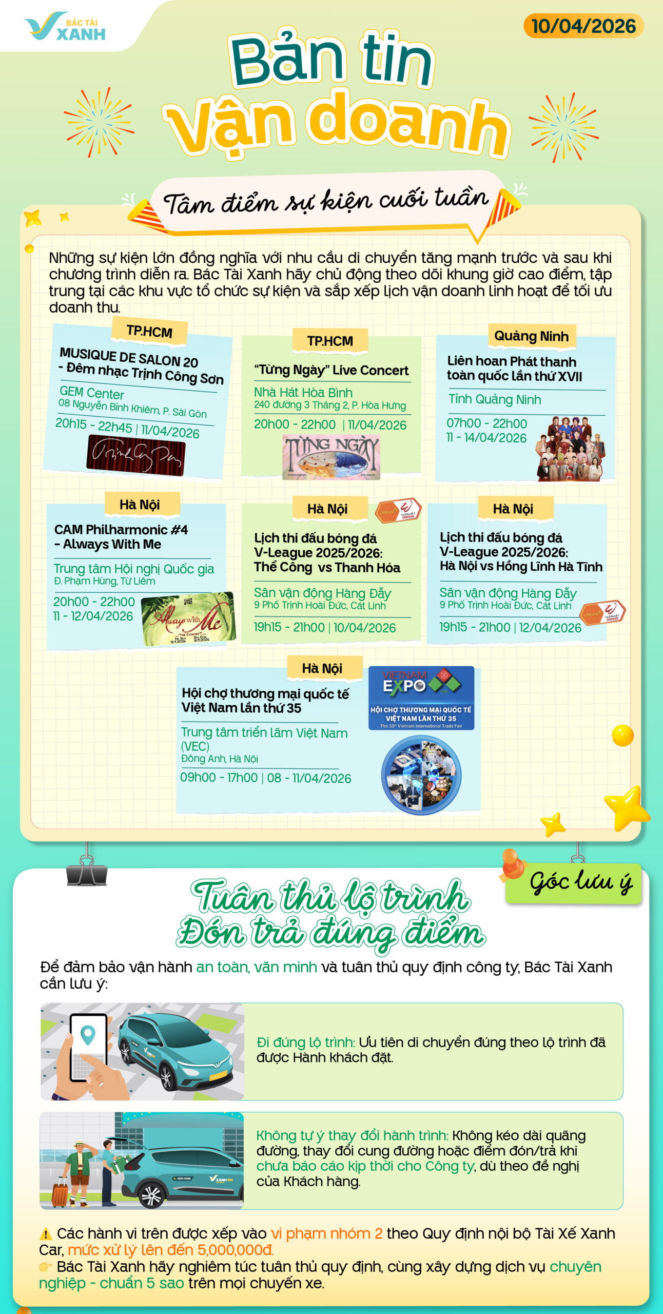 Cuối tuần đang đến gần với nhiều sự kiện, đây là thời điểm nhu cầu di chuyển tăng cao, mở ra cơ hội để Bác Tài Xanh gia tăng cuốc và bứt tốc thu nhập. Bên cạnh đó là những cập nhật về các chính sách thưởng hấp dẫn, hãy cùng bản tin vận doanh ngày 10/04 khám phá nhé!