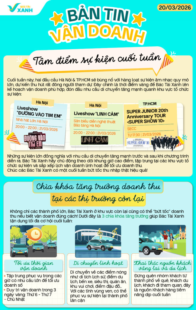 Bản tin vận doanh 20/03 mang tới cho các Bác Tài Xanh không chỉ lịch “tâm điểm sự kiện” mà còn là mẹo vận doanh bứt phá doanh thu cuối tuần. Bên cạnh đó, Bác Tài Xanh hãy cùng thực hiện việc cập nhật thông tin địa chỉ theo hướng dẫn chi tiết trong bản tin để đảm bảo vận doanh hiệu quả nhé!