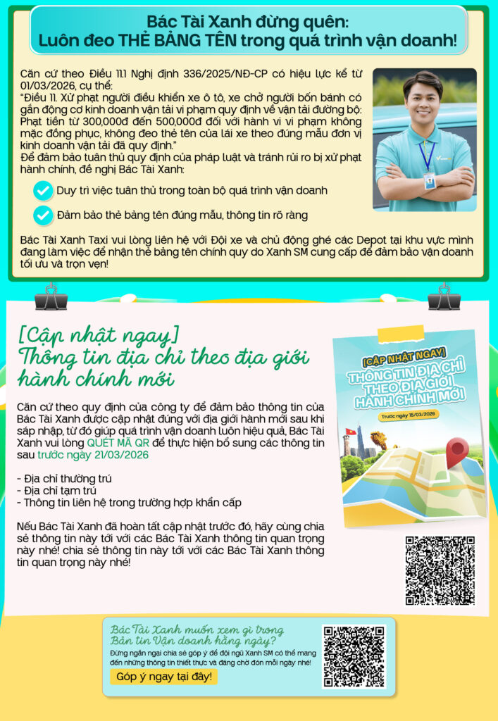 Và đừng quên, nếu Bác Tài Xanh có góp ý hay chia sẻ thêm mong muốn, hãy gửi lại cho đội ngũ Xanh SM để Bản tin mỗi ngày thêm thiết thực và đáng mong chờ hơn!