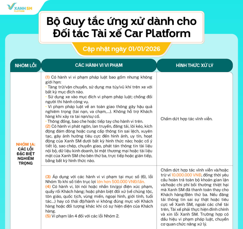 Nhằm đảm bảo sự đồng bộ trong quy chuẩn vận hành, Xanh SM chính thức cập nhật Bộ Quy tắc Ứng xử (QTUX) dành cho Đối tác Tài xế Car Platform. Bộ quy tắc mới được áp dụng từ ngày 01/01/2026, thay thế cho Bộ QTUX hiện hành.