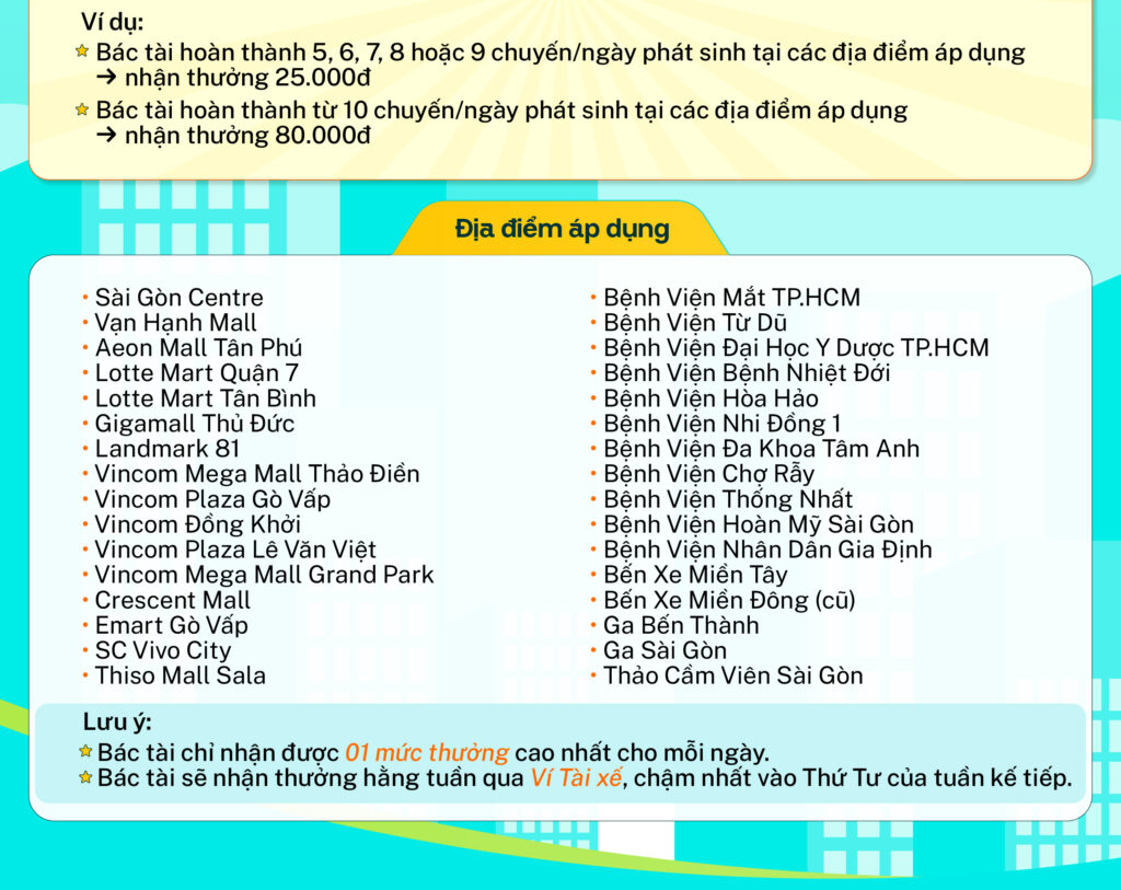 Bác tài chỉ cần thuộc lòng và chăm chỉ vận doanh các địa điểm sau để có cơ hội ôm trọn tiền thưởng đến 80.000đ/ngày nhé!